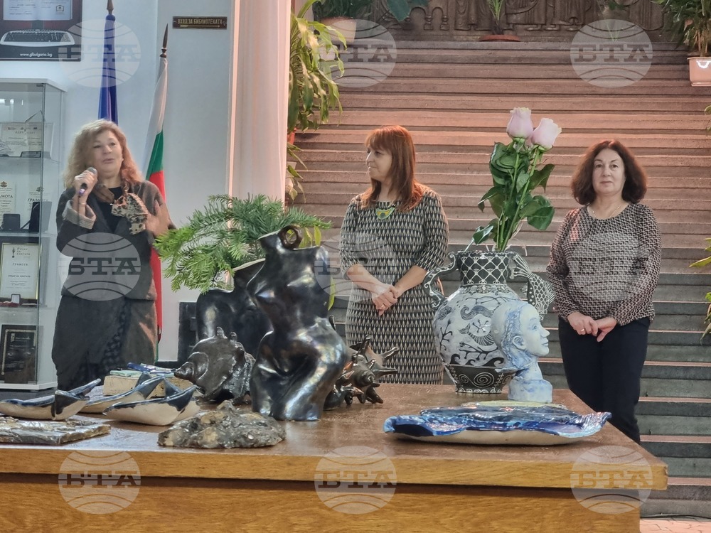Във фоайето на Регионалната библиотека във Велико Търново беше открита изложба с керамични творби от авторите към ателието "Творилница за щастливи хора", снимка: кореспондент на БТА във Велико Търново Марина Петрова