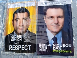 Тридесет и осем годишният Джордже Симион, председател на втората по големина парламентарна партия и най-голямата опозиционна сила, спечели убедително първия тур на 4 май с около 40,96 процента от гласовете. Далеч след него, с 20,99 процента, се класира 55-годишният Никушор Дан.