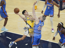 Паскал Сиакам бе много солиден с гръб към коша и отбеляза 21 точки, а Индиана спечели мача предимно благодарение на резервите си, които реализираха 49 точки срещу само 18 за дубльорите на Оклахома Сити. Канадецът Бенедикт Матюрин също се включи силно от пейката с 27 точки, както и резервният плеймейкър Ти Джей Макконъл с 10 точки, 5 асистенции и 5 пресечени топки.