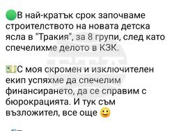 В публикацията си той казва: „Днес новината е само една. В най-кратък срок започваме строителството на новата детска ясла в "Тракия", за осем групи, след като спечелихме делото в Комисията за защита на конкуренцията (КЗК). С моя скромен и изключителен екип успяхме да спечелим финансирането, да се справим с бюрокрацията. И тук съм възложител, все още“, пише в публикацията. Според Владимир Темелков това е поредната стъпка в разрешаването на проблема с липсата на места в яслите и детски градини.