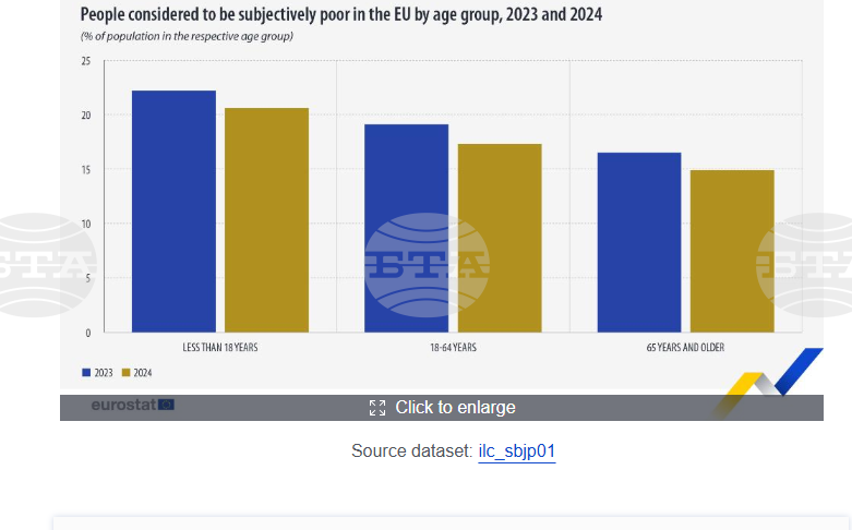 Най-висок е процентът на субективно бедни в ЕС през 2024 г. сред хората под 18 години – 20,6 на сто. Във възрастовата група 18–64 години 17,3 на сто се считат за субективно бедни, а сред по-възрастните (65 години и нагоре) този дял е 14,9 на сто.