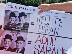 Не липсваха и иронични колажи, на които президентът Никушор Дан и премиерът Илие Боложан бяха представени като Лоръл и Харди - комедиен дует от ранната класическа холивудска ера на американското кино, видя на място БТА.