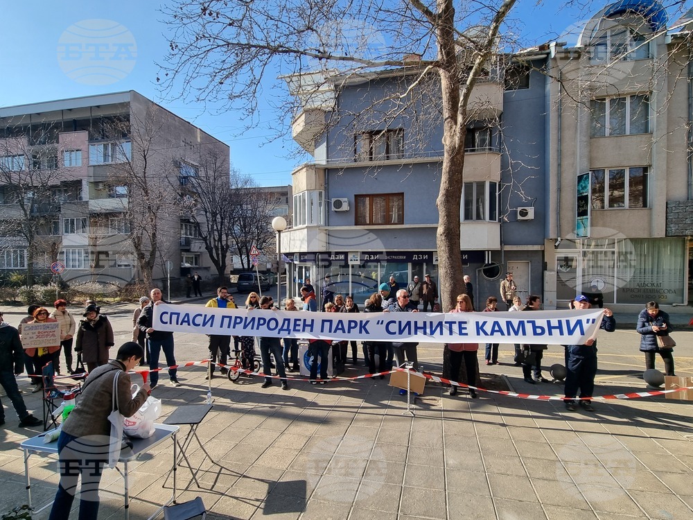 Хората, които носеха плакати с надписи "Спаси Природен парк "Сините камъни", "Парк "Сините камъни" не се продава! Да спрем грабежите!", "Искаме природа, не искаме бетон!" и др., поставиха ограждения с ленти на тротоара пред сградата на администрацията, за да покажат абсурдността на поставянето на граници в държавна собственост.