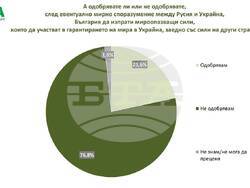 Те посочват, че практически единодушно е обществото ни, че войната трябва да спре и да има преговори. Българите обаче, добавят от "Мяра", са солидарни с позицията за по-ясни гаранции за бъдещето на Украйна. Повечето анкетирани виждат засега да надделява Русия и може би в този въпрос се оглежда и донякъде инерционна благосклонност. Тя се проявява и във въпроси като кой е виновен и кой започна войната – в тях Украйна не получава съществени обвинения, но като че ли целият Западен свят изглежда натоварен в очите на българите с отговорност, дори по-голяма от тази на самата Русия. Със сигурност обаче у нас няма обществена нагласа за участие в евентуална мироопазваща военна мисия в Украйна. Като цяло повечето благосклонност към Москва личи още по-ясно при по-възрастните, добавят от "Мяра".