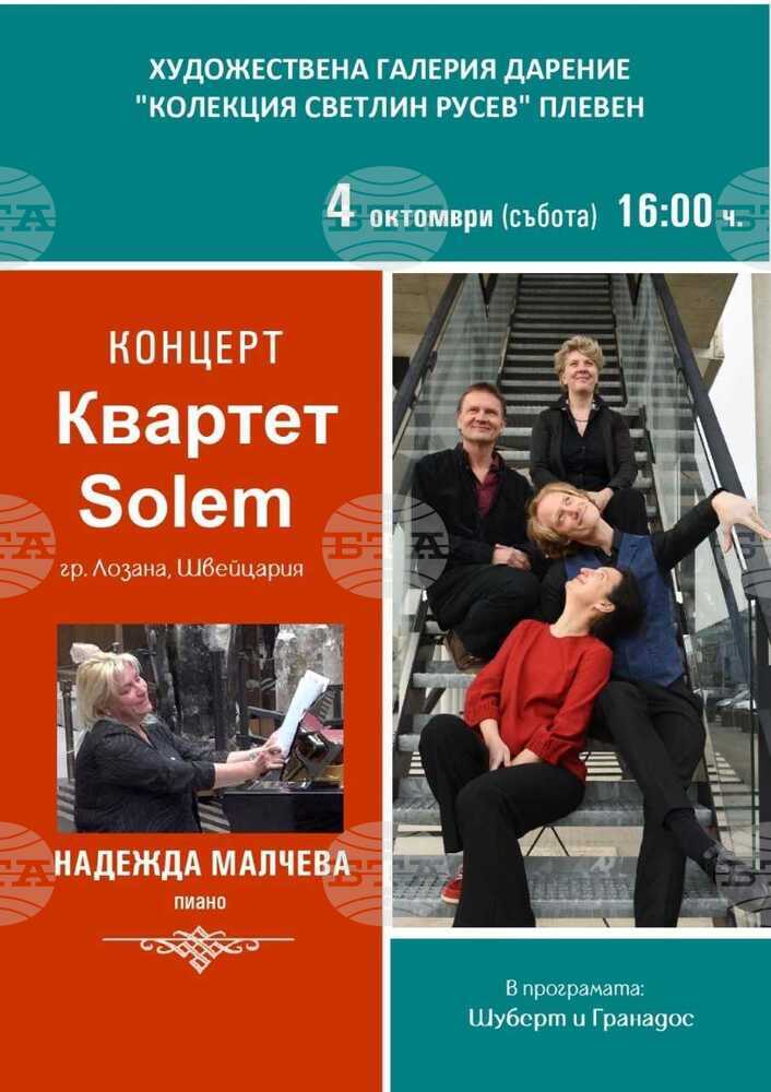 Квартет Solem и пианистката Надежда Малчева ще изнесат камерен концерт в Плевен. Той ще се състои утре, 4 октомври, в Художествена галерия Дарение "Колекция Светлин Русев“, съобщиха за БТА организаторите.