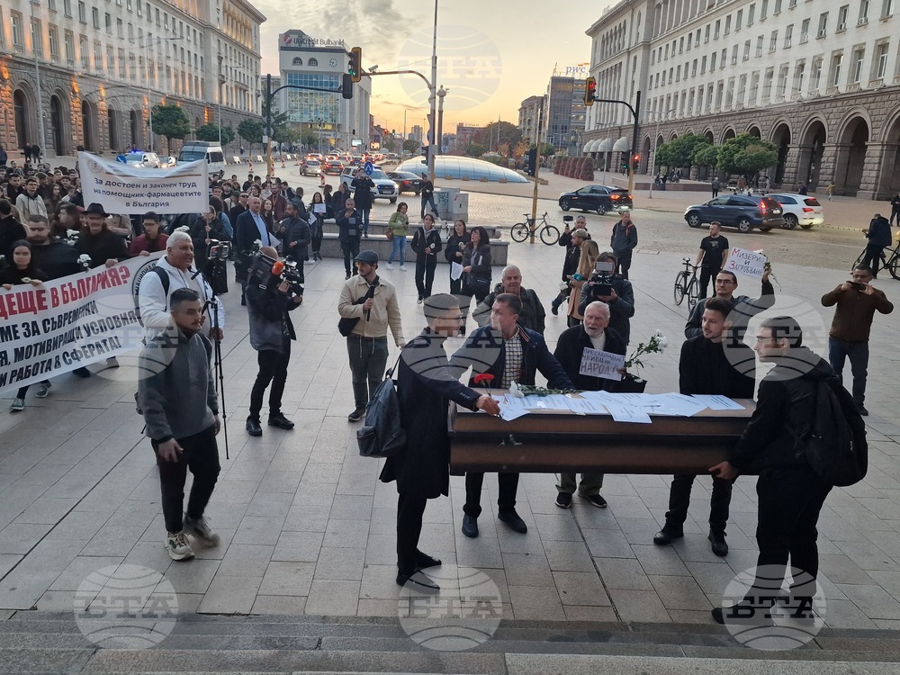 Протестиращите млади лекари поставиха ковчег пред входа на Народното събрание. Движението в участъка от Народното събрание към Орлов мост е преустановено към момента. Протестът е под надслов „Погребението на едно бъдеще“.