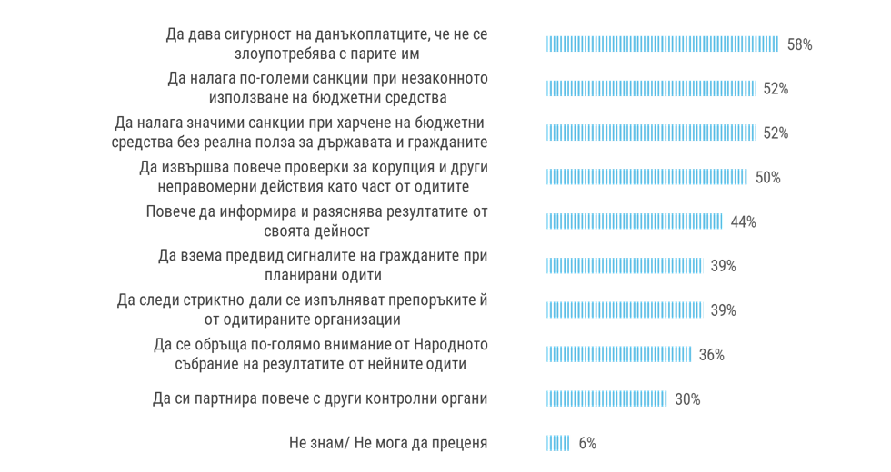Това очакват гражданите от Сметната палата, показва представително социологическо проучване, възложено от одитната институция на социологическата агенция „Тренд“.