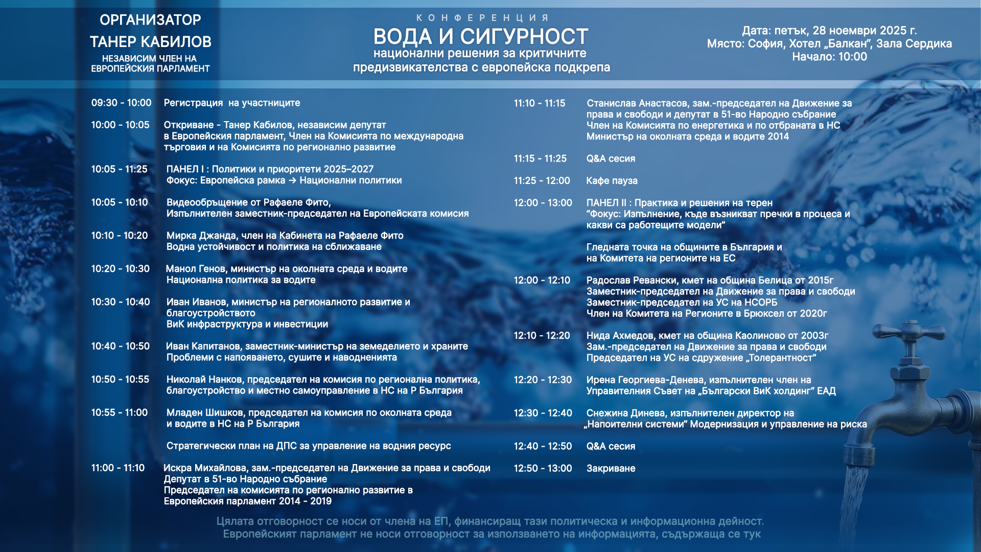 Имам удоволствието да Ви поканя да присъствате на конференция: Вода и сигурност - национални решения за критичните предизвикателства с европейска подкрепа, която организирам на 28 ноември 2025 г., в град София, хотел Балкан Палас.