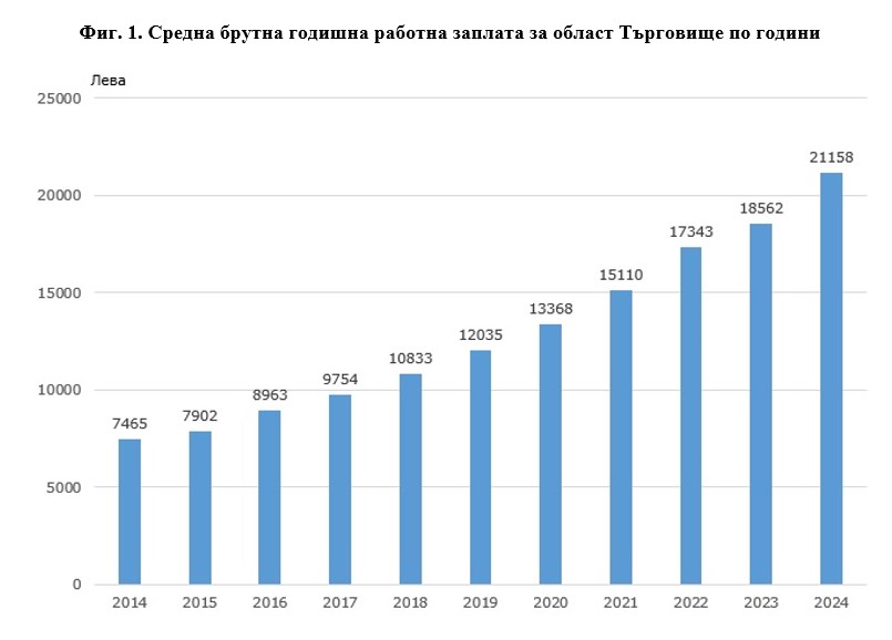През 2024 г. средната годишна брутна работна заплата в област Търговище се увеличава спрямо 2023 г. с 14.0%. Икономическите дейности, в които е регистрирано най-голямо увеличение, са „Създаване и разпространение на информация и творчески продукти; далекосъобщения“, „Производство и разпределение на електрическа и топлинна енергия и на газообразни горива“, „Култура, спорт и развлечения“, „Операции с недвижими имоти“ и „Хуманно здравеопазване и социална работа”.