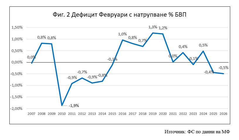 Дефицитът за февруари месец с натрупване е в размер на -600 млн. евро и представлява -0,5% от БВП. Дефицитът само за февруари месец е -812 млн. евро и е на стойност -0,7% от БВП.