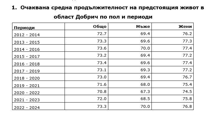 site.btaТСБ Североизток, ОСИ Добрич: Очаквана средна продължителност на предстоящия живот на населението в област Добрич през периода 2022 - 2024 година