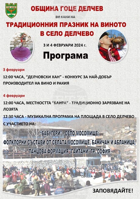 Община Гоце Делчев – Прессъобщение Община Гоце Делчев: Традиционният празник на виното в село Делчево ще се проведе на 3 и 4 февруари 2024 г.
