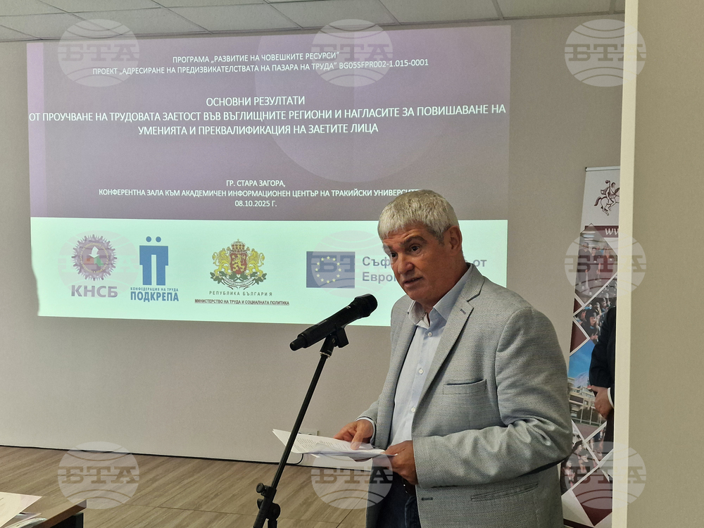 В Тракийски университет - Стара Загора публично бяха представени резултатите от проучване на трудовата заетост във въглищните региони и нагласите за повишаване на уменията и преквалификация на заетите лица. На снимката: президентът на КНСБ Пламен Димитров.Снимка: кореспондент на БТА в Стара Загора Емил Димов