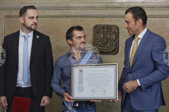 ОБНОВЕНА Кметът Васил Терзиев и председателят на СОС Цветомир Петров връчиха отличието "Почетен гражданин на София" на Алберт Попов