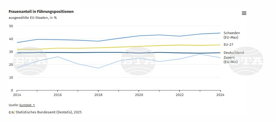 През 2024 г. 29,1 на сто от висшите управленски длъжности в Германия са били заети от жени, което е под средното за ЕС равнище от 35,2 процента. Делът почти не се е променил от 2014 г. насам, въпреки че средната стойност за ЕС се е повишила с около 3,4 процентни пункта, съобщи базираната във Висбаден служба.