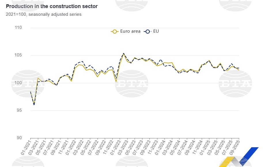 На годишна база - спрямо септември 2024 г. - производството в строителството е нараснало с 0,5 на сто в ЕС, но е намаляло с 0,3 на сто във валутния съюз.