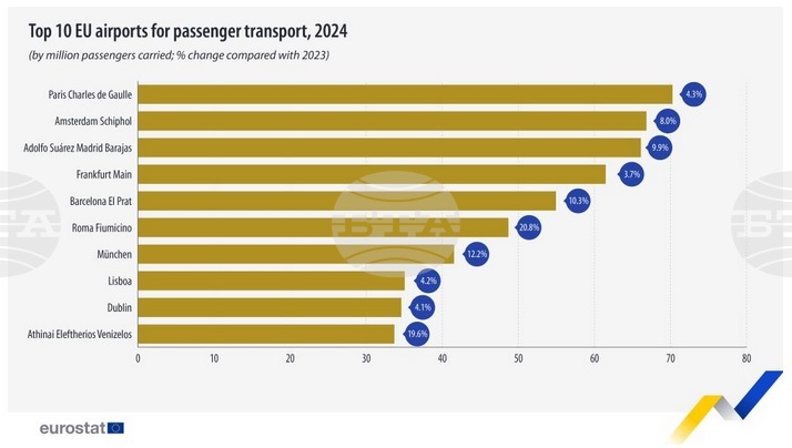 През 2024 г. класацията на първите десет европейски летища според натовареността, не се променя значително, като 9 от тях остават същите както през 2023 г., но всички те отчитат увеличение на пътникопотока. През парижкото „Шарл дьо Гол“ са преминали 70,3 милиона пътници или с 4,3 на сто повече спрямо предходната година. В класацията следват амстердамското „Схипхол“ с 66,8 милиона пътници, или ръст от 8 на сто, мадридското „Барахас“ с 66,1 милиона пътници, или увеличение от 9,9 на сто, летище Франкфурт на Майн - 61,5 милиона пътници, ръст от 21,5 на сто, както и барселонското „Ел Прат“ с регистрирани 54,9 милиона – ръст с 10,3 на сто.
