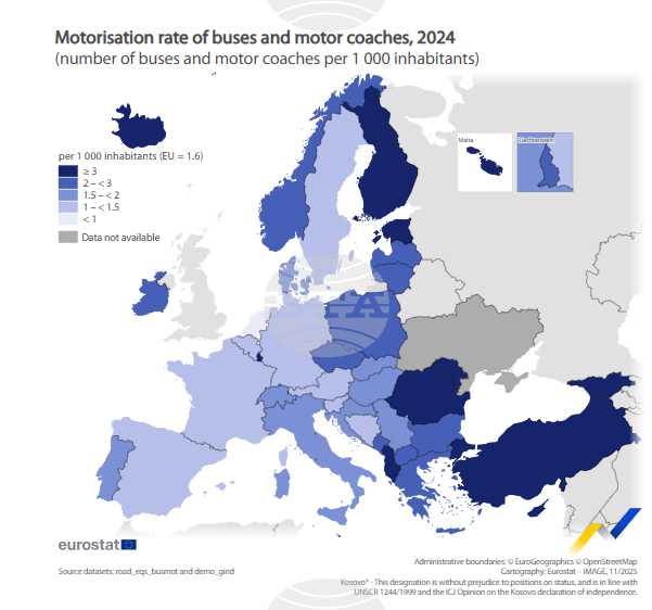 Най-висок брой автобуси на глава от населението се отчита в Малта (4,6), следвана от Люксембург (4,0) и Естония (3,7). Най-ниските стойности са в Нидерландия (0,5), Германия (1,0) и Австрия (1,2).
