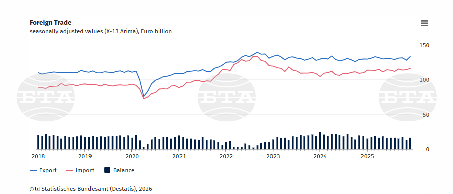 Увеличението на износа в края на годината създава предпоставки за постепенно възстановяване на германската икономика, която през 2025 г. отчете минимален растеж от 0,2 на сто и едва избегна трета поредна година без икономически растеж, посочва ДПА. За 2026 г. федералното правителство прогнозира растеж от 1,0 на сто.