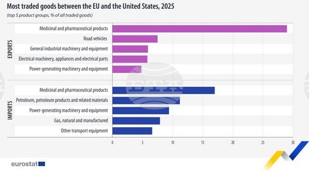 През 2025 г. Европейският съюз е изнесъл за САЩ стоки на стойност 554 млрд. евро, а е внесъл за 354,4 млрд. евро, което води до търговски излишък от 199,6 млрд. евро - най-високият за последните 10 години, въпреки наложените мита от президента на САЩ Доналд Тръмп. Това съобщи днес европейската статистическа служба Евростат на сайта си.