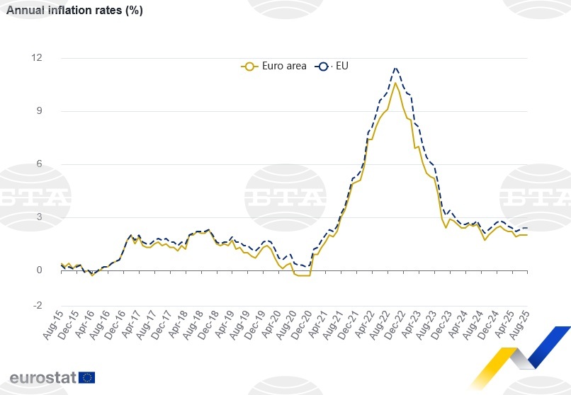 Инфлацията в Европейския съюз остава без промяна през август на ниво от 2,4 на сто на годишна основа, както бе отчетено и през юли. В еврозоната инфлацията през август също остава без промяна – 2 на сто, както и през предходния месец, което е целевото равнище, определено от Европейската централна банка (ЕЦБ). Това сочат най-новите ревизирани данни на европейската статистическа агенция Евростат, публикувана днес на официалния ѝ сайт. Така институцията леко ревизира данните надолу, след като в началото на този месец обяви, че очаква инфлацията в еврозоната да се е повишила до 2,1 на сто през миналия месец.