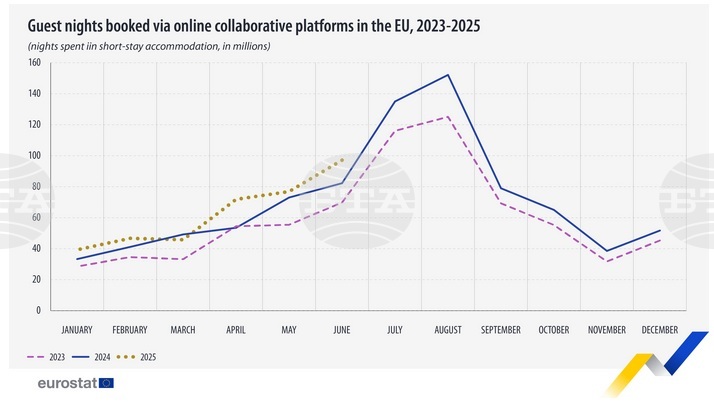 През второто тримесечие на 2025 г. са били осъществени 245,9 милиона нощувки в места за краткосрочно настаняване в ЕС, резервирани чрез платформи като "Еърбиенби" (Airbnb), "Букинг" (Booking) или "Експидиа" (Expedia), отчита Евростат.
