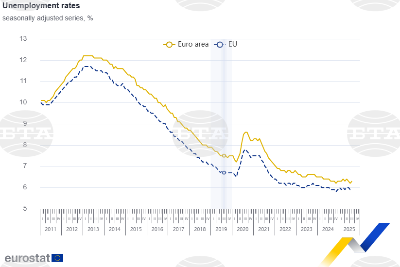 През август 2025 г. сезонно изгладеното равнище на безработица в еврозоната е 6,3 на сто, което е леко повишение спрямо 6,2 на сто през юли и без промяна на годишна база, показват публикувани днес данни на Евростат, статистическата служба на ЕС.