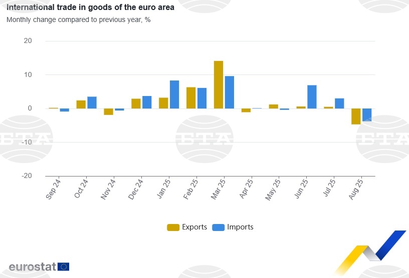 За еврозоната балансът при търговията със стоки е бил на излишък от 1 милиард евро през август 2025 г., в сравнение с излишък от 3 милиарда евро през август 2024 г.