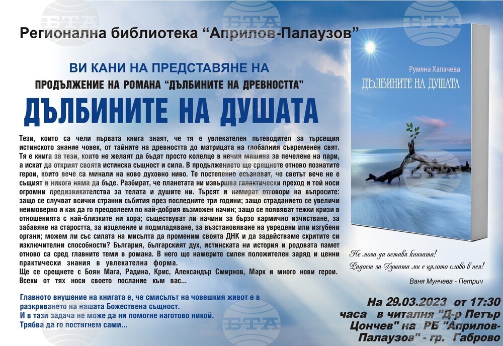 Тази сряда, 29 март, от 17:30 часа в Регионална библиотека „Априлов-Палаузов“, Габрово ще бъде представен романът „Дълбините на душата“ от Румяна Халачева, информират от културната институция.