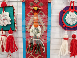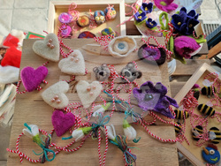 Повечето от тях са подготвили тематични изделия за Първи март, интерпретиращи символа на мартеницата. Силвия Стоянова показва както шалове от вълна и коприна, така и плъстени мартеници и брошки в различни форми. С бижута от полимерна глина присъства Галя Минчева. Векова е подготвила украшения за дома в колажи от керамика, текстил, дантела, вълнена прежда. Целта ми е да направя чрез синтез нови произведения, носещи празничност и създаващи усещането, че гледаш част от носия, обясни тя. Художничката изработва и колажирани от картон и хартия бележници и кутии. Диана Раданова по традиция интерпретира първомартенската тема в своите бижута от топено стъкло с бял и червен цвят, но освен тях има и много накити за дамския празник, както и изделия за дома като часовници и огледала от художествено стъкло.