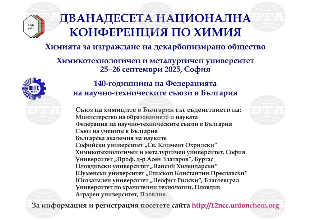 От 25 до 26 септември 2025 г. в Химикотехнологичния и металургичен университет – София, ще се проведе Дванадесетата Национална конференция по химия, организирана под мотото „Химия за изграждане на декарбонизирано общество“. Конференицята се организира от Съюза на химиците в България със съдействието на Министерството на образованието и науката, Федерацията на научно-техническите съюзи в България, Съюза на учените в България, Българската академия на науките, Софийския университет „Св. Климент Охридски“, Химикотехнологичния и металургичен университет – София; Университета „Проф. д-р Асен Златаров“ – Бургас, Пловдивския университет „Паисий Хилендарски“, Шуменския университет „Епископ Константин Преславски“, Югозападния университет „Неофит Рилски“ - Благоевград, Университета по хранителни технологии – Пловдив и Аграрния университет – Пловдив.
