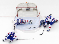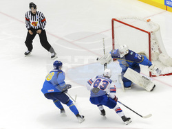 След като разчиташе на 22-годишните вратари Максим Павленко и Джелал-ад-дин Амирбеков в останалите мачове от груповата фаза, този път на вратата на Казахстан застана Сергей Кудрявцев. В първия си старт на турнира 30-годишният ветеран, бивш играч на Барис Астана, спаси 21 от 26 удара, преди да бъде заменен от Павленко в последната третина.