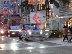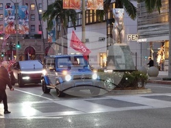 По централния булевард "Родео Драйв", известен с магазините си за луксозни стоки, преминаха трийсетина автомобила с оглушителен рев на двигатели и свирещи клаксони. От прозорците им се развяваха знамена "Бевърли Хилс за Доналд Тръмп" и "Тръмп-Ванс 2024".