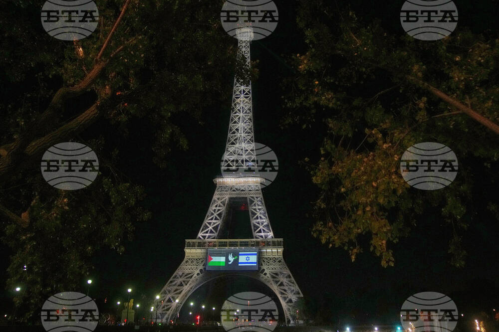 В навечерието на обявяването от Макрон на френското признаване на Държавата Палестина на Айфеловата кула в Париж пък бяха прожектирани израелското и палестинското знаме и между тях бял гълъб с маслинова клонка в човката.