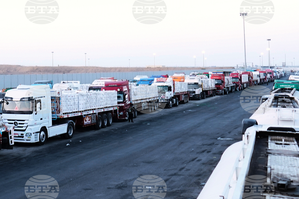 Камиони с хуманитарна помощ за ивицата Газа от египетската страна на граничния пункт "Рафах", 20 октомври 2025 г. Снимка: АП/Mohamed Arafat