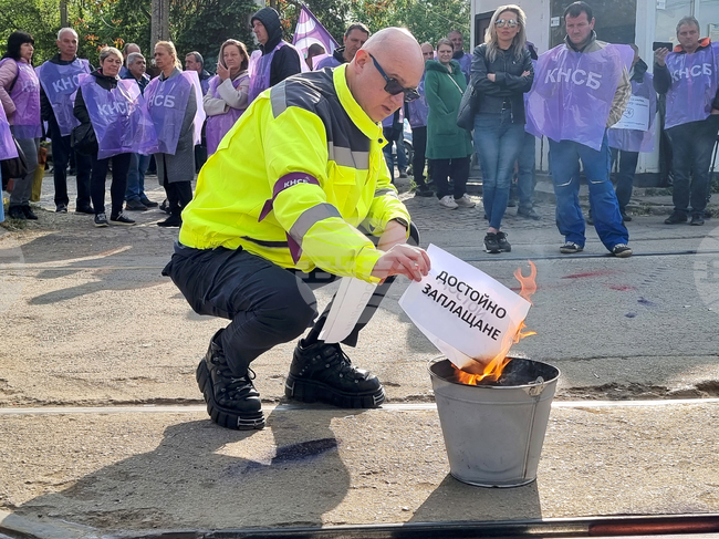 Символично бяха изгорени няколко от исканията на протестиращите служители на столичния градски транспорт пред трамвайното депо в кв. „Банишора“