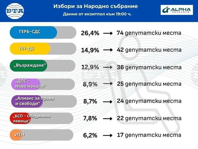 Според първите резултати от екзитпола на „Тренд“ за парламентарните избори ГЕРБ-СДС е с 26,1 %, ПП-ДБ - 14,3 %