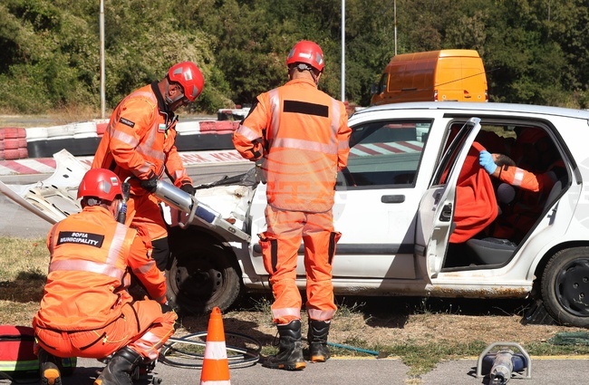 Екип за аварийна помощ и превенция към Столична община демонстрира как се помага на пострадал при пътно произшествие