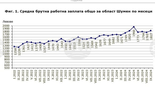 Средната брутна заплата в Шуменско през третото тримесечие на годината намалява спрямо второто с 3,1 процента, по данни на статистиката