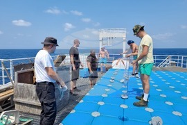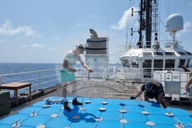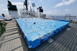 The crew of the Bulgarian military research vessel Sv. Sv. Kiril i Metodii (NAVAL RSV 421) assembled a pontoon raft, which will be used to carry provisions, construction materials and equipment for the Bulgarian Antarctic base on Livingstone Island. RSV 421 is transporting material to support the 31st Bulgarian Antarctic Expedition. The raft is made up of 135 plastic cubes. It is 4.5 metres wide and 7.7 metres long and has a maximum loading capacity of 12 tons. It is equipped with metal rings and lashing equipment that help to secure the load on top of it, as well as to pull it by boat, Stoyko Gospodinov, chief bosun of RSV 421, explained to BTA. Photo: Konstantin Karagyozov