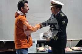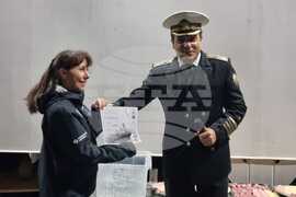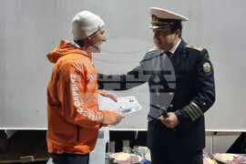 Drake Passage (March 11, 2023) Hours before arriving in the Chilean port of Punta Arenas, the commander of the Bulgarian naval research vessel Sv. Sv. Kiril i Metodii (RSV 421), Commander Nikolay Danailov (right), congratulated his crew, as well as the Bulgarian and Spanish polar explorers on board the vessel, on the successful crossing of the Drake Passage, which is considered one of the stormiest and most dangerous sea lanes in the world. A small ceremony was held on the starboard side of RSV 421, where those present received certificates for crossing the sea strait that separates the South Shetland archipelago from South America.