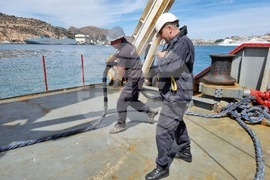 Cartagena (14.04.2023) Shortly before 1:00 pm central European time on Friday, the Bulgarian naval research vessel Sv. Sv. Kiril i Metodii (RSV 421) reached the Spanish port of city of Cartagena. Cartagena is RSV 421's intermediary stop on its journey back to Varna after its participation in the 31st Bulgarian Antarctic expedition on Livingston Island. The Bulgarian ship was met by a local maritime pilot that helped it maneuver through the port's bay and lighthouses to its designated lace in the local naval base, where RSV 421 was docked with the help of port workers. Photo: Konstantin Karagyozov / BTA