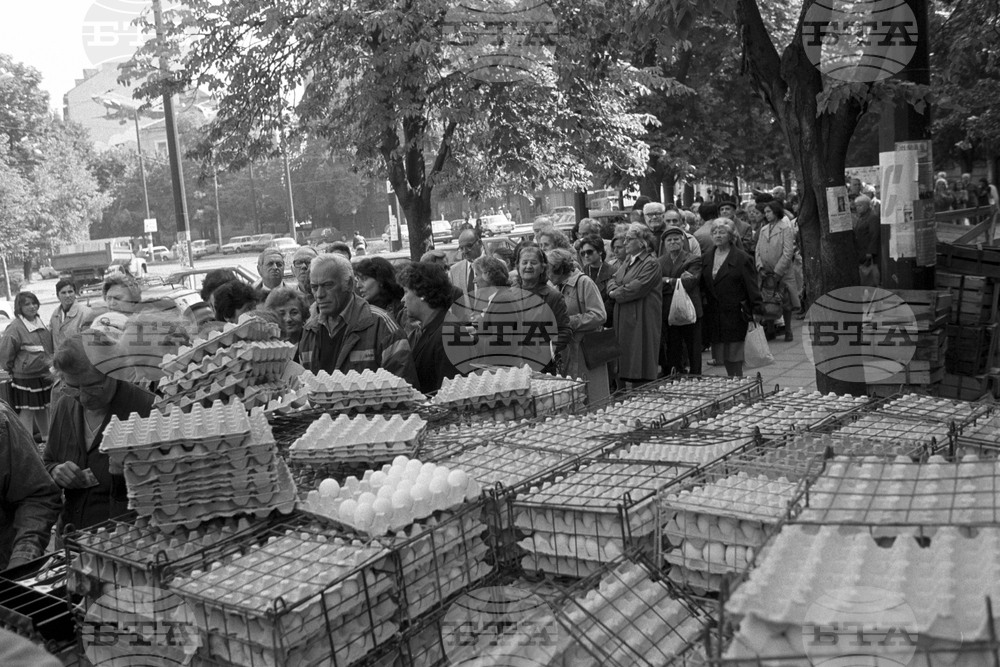 Huge queues formed outside supermarkets in Bulgaria in September 1990 as a result of severe shortages of staples at a time of a severe economic and political crisis, as the country transitioned from a planned to a market economy.