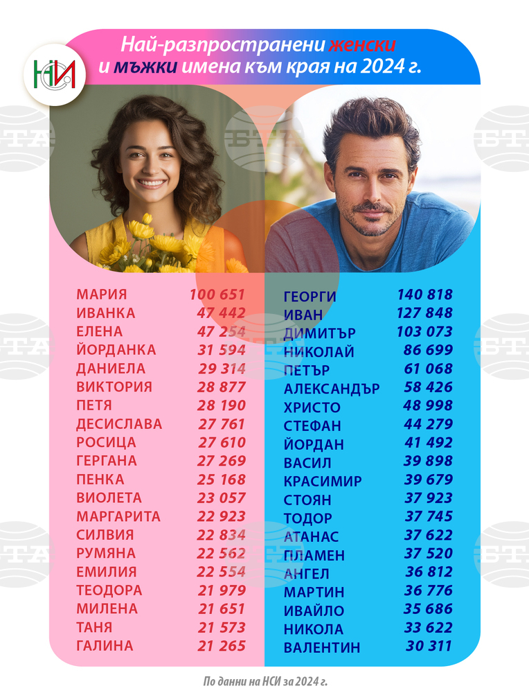 The National Statistical Institute on Friday published a list of the most popular given names in Bulgaria as at the end of 2024.